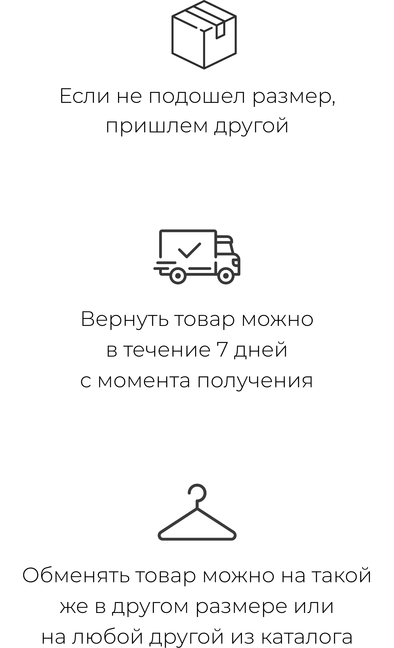 Если вам неподошел размер, вы можете обменять вещь на такую же в другом размере. При условии, что нужный вам размер есть в наличии. Для оформления обмена свяжитесь с нами.